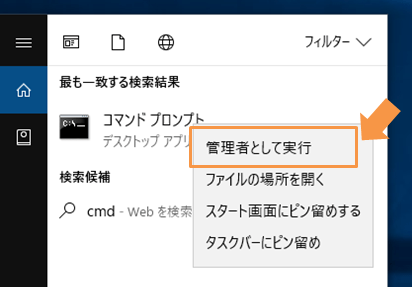 コマンドプロンプト起動時に、右クリックで「管理者として実行」を押すと、コマンドプロンプトを管理者権限で起動できます。