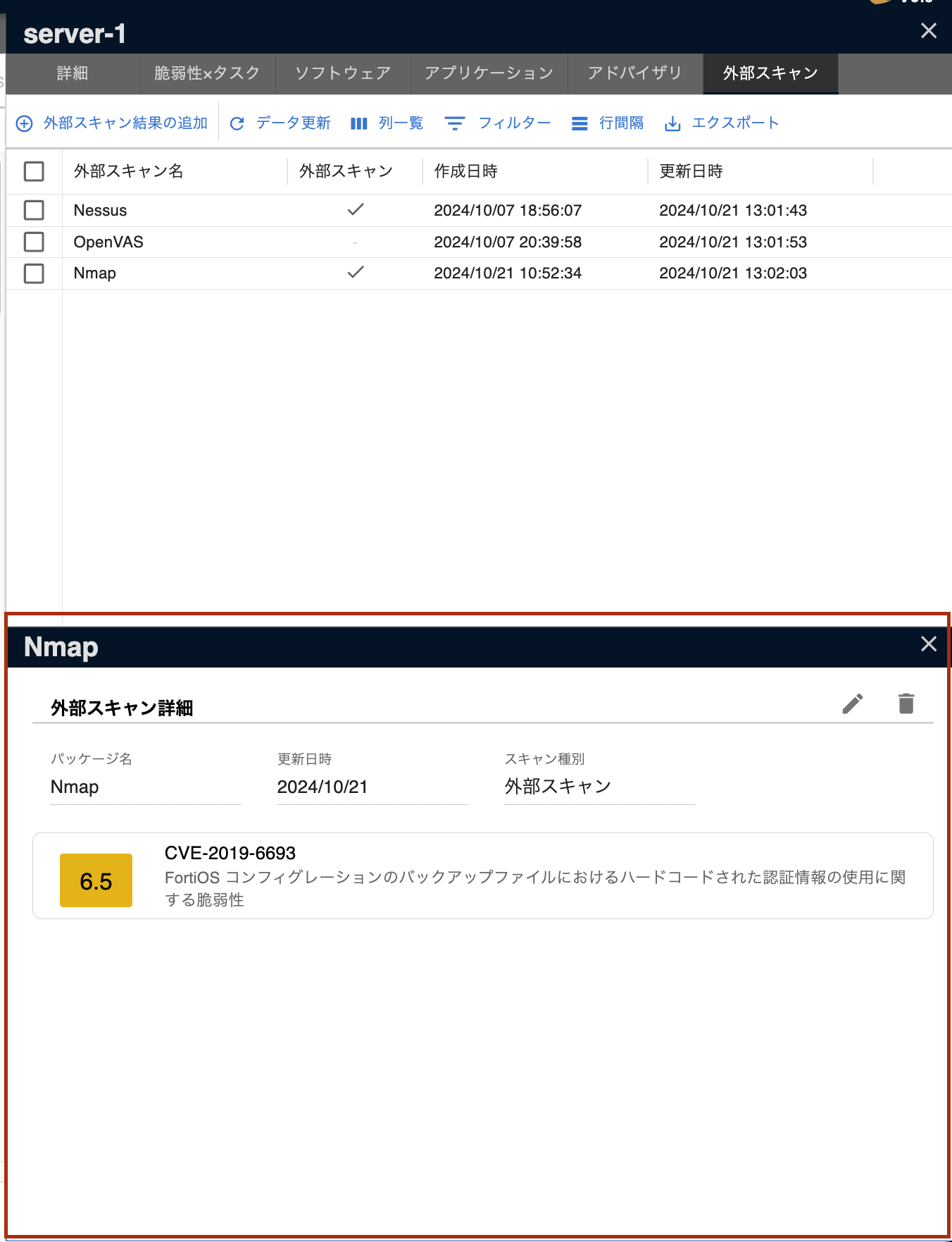 外部スキャン詳細では追加した外部スキャン結果の詳細の確認、更新ができます。