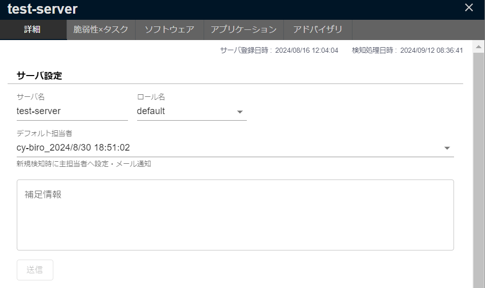 「サーバ名」「ロール名」「デフォルト担当者」「補足情報」を設定できます。