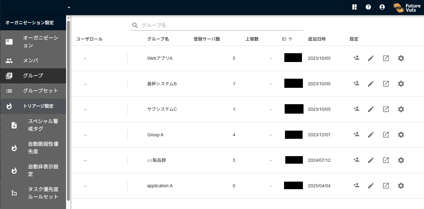 オーガニゼーション内のグループ管理や新規にグループの作成を行えます。