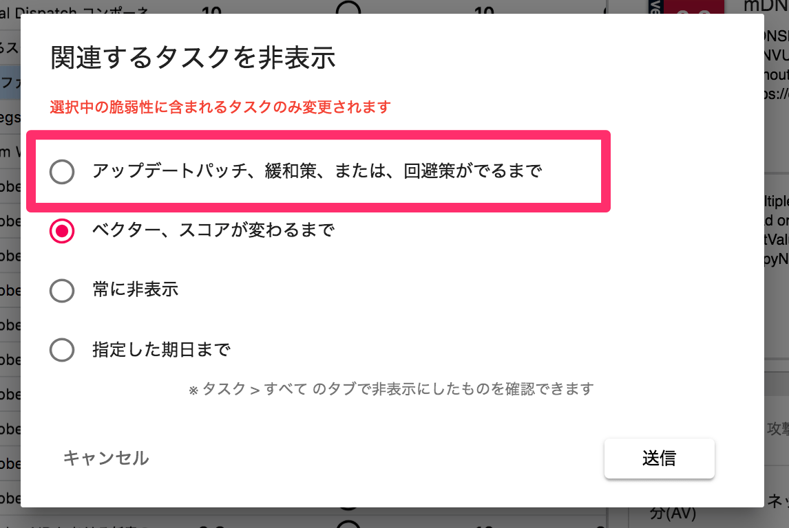 脆弱性を検知した時点では、アップデートパッチ、緩和策、回避策がベンダから提供されてないケースが多々ありますが、タスク非表示の条件として指定できるようになりました。