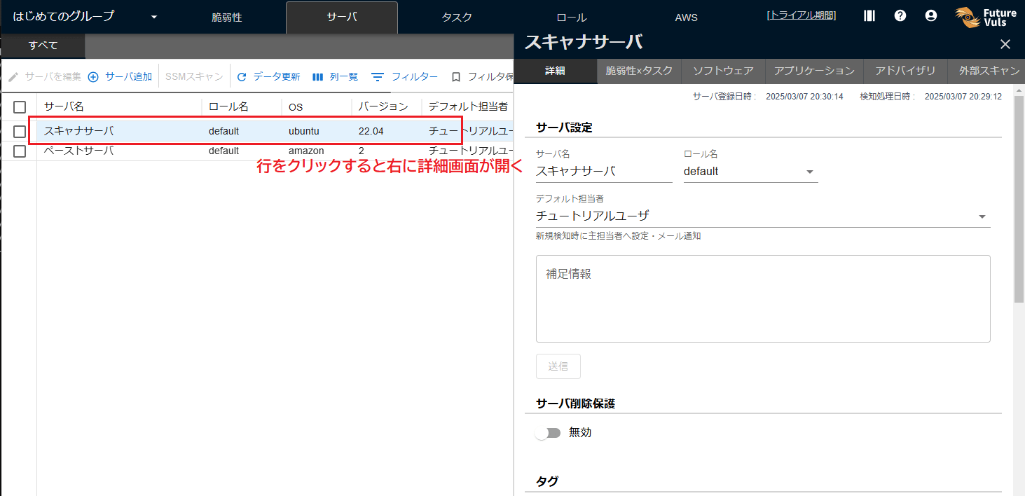 ここでは、サーバの追加で FutureVuls に登録したサーバ情報を見ていきます。
